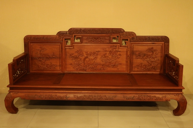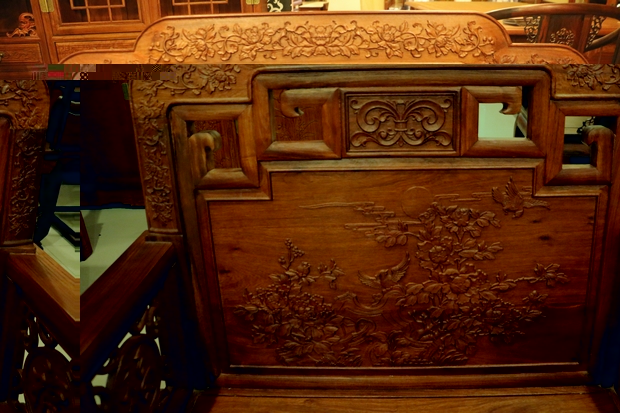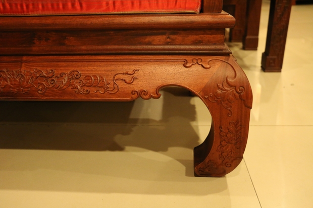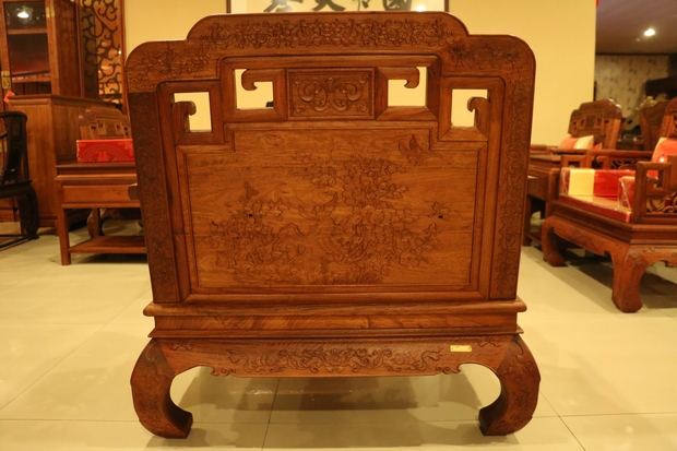 沙發的其他各處細節。其座椅面,平整略帶淡雅的原木光澤,顯得十分地古典清秀,清新而自然。沙發的四處椅角設計則比較有特色,非一般沙發筆直或稍顯圓潤的直線型豎直設計,其風格有些像動物的犄角,彎曲而延伸,安然優雅而簇立,顯得地十分溫婉可掬,驚艷動人,就如同那華貴的牡丹,艷壓在那群芳之中,清新而脫俗。而椅座面下方與椅腳相連的幾段木橫處,同樣飾繪有牡丹的圖案紋飾,并且在其左右兩端各串有幾銜銅錢,隱含著“滾滾財源”“富貴吉祥”的寓意。