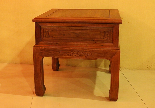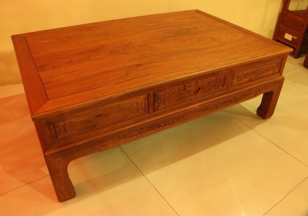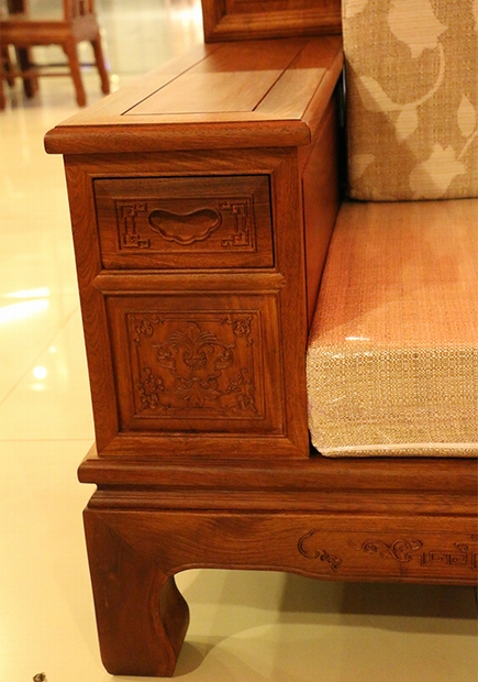除紋飾外,在整體做工表現上,幾處沙發的座腿都極為矮實,配上的一布稍為高嚴的軟墊則正好彌補了沙發的座高,使其處于正當位置,加上高的靠背組合,使人座位使用時更為舒適健康。整套沙發另還有抽屜設計留置,位置在三件沙發的左右兩處扶手處的前端以及兩條高幾、小平幾的上方,其外抽均為無拉環純天然凹陷心型樣式設計,質樸美觀。