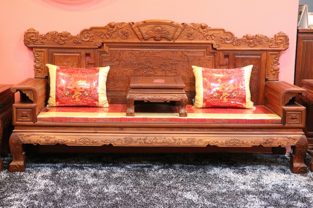 再往上,扶手處下端的前方位置均還外設有一小框格之抽屜,方便亦實用;而框格的上方則是兩處設計為鏤空式的長框格扶手,扶手左右的末端均以卷曲收尾,秀氣端莊圓潤舒適,而鏤空內則是以兩顆壽桃作為承托雕刻,形象意寓生動。另在實用性方面,該系列的沙發也借鑒了現代沙發座椅中軟綿舒適的使用特點,在座面上以及靠背板處還添備有一席軟墊以及靠背枕作為置換,根據環境需要以及個人使用習慣特點進行選擇性添置或撤換,十分方便。