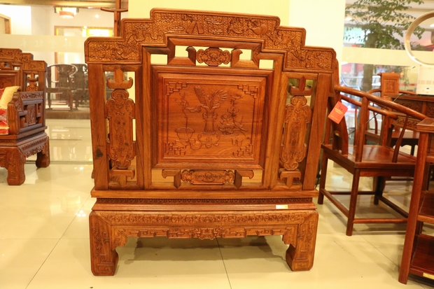 沙發正上方為一條橫架著的左右兩邊呈三截"樓梯"式樣的長板,長板的正面和背面都刻畫了許多喻示著吉祥平安福到之意的法器寶物,譬如道家八寶中的:鐵拐李的寶葫蘆、曹國舅的玉板、何仙姑的荷花以及藍采和的花籃等。