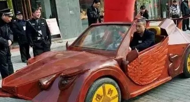 千萬別小看了坐在這個紅木跑車里的小哥,人家可是土豪!據說光制作該紅木跑車就花費了幾十萬,耗時半年多,真會玩!
